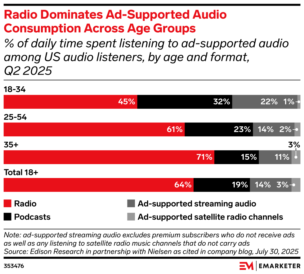 The news: Edison Research’s Q2 2025 “Share of Ear” report revealed key trends in ad-supported audio and what channels are winning. The conclusion? Radio is still dominating in time spent across age groups—and while podcasts are gaining ground, the shift is slow. Our take: Strategies that focus solely on podcasts at the expense of radio will fail to capitalize on the full potential of ad-supported audio. Brands that combine radio’s enduring reach while accounting for podcasts’ ability to engage and drive action will unlock the best outcomes.