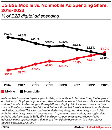 When will mobile surpass nonmobile in B2B ad spend?