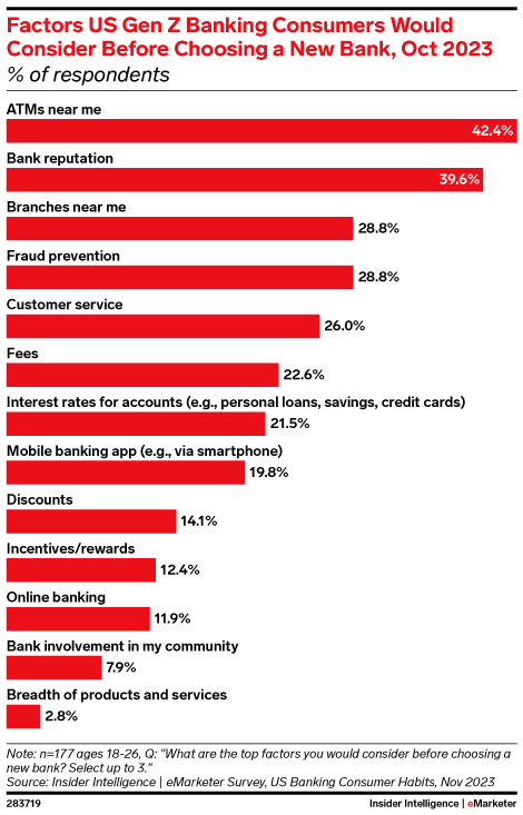 42.4% of US Gen Z banking consumers would consider their proximity to ATMs as a factor before choosing a new bank, while 28.8% would consider their distance to a branch, according to our survey. By contrast, 39.6% would consider the bank’s reputation.