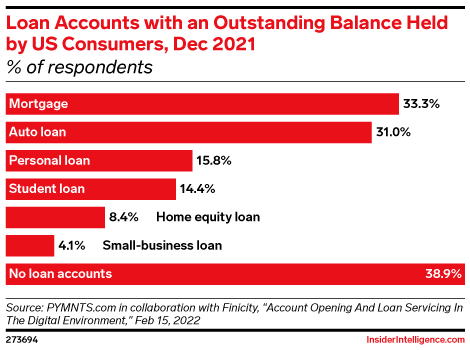 The majority of US consumers are shouldering loan debt, with 61.1% holding one or more loan accounts with an outstanding balance. The most common types of accounts to have an outstanding balance are mortgages (33.3%) and auto loans (31.0%).