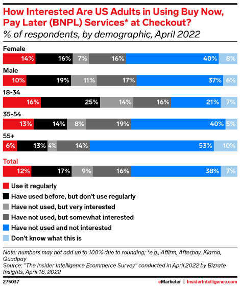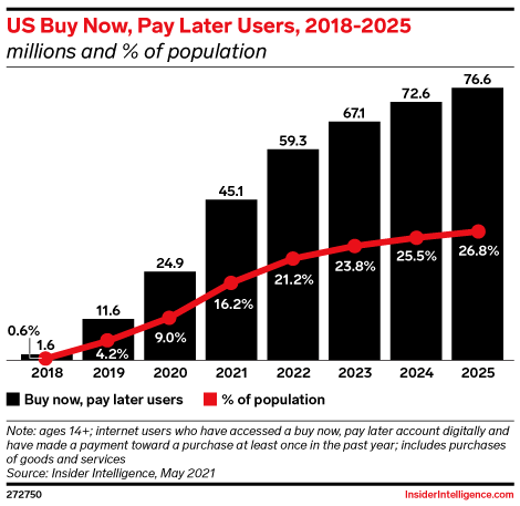 Klarna is the most popular buy now, pay later (BNPL) service in the US, with 34.8 million users ages 14 and older. Afterpay takes the No. 2 spot with 20.0 million, and Affirm comes in third with 14.0 million.