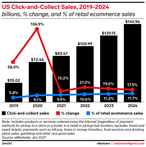 US click-and-collect sales more than doubled in 2020, driven by the coronavirus pandemic, and will sustain double-digit growth rates over the next four years. Over 150 million people will make a purchase via click and collect at least once in 2021.