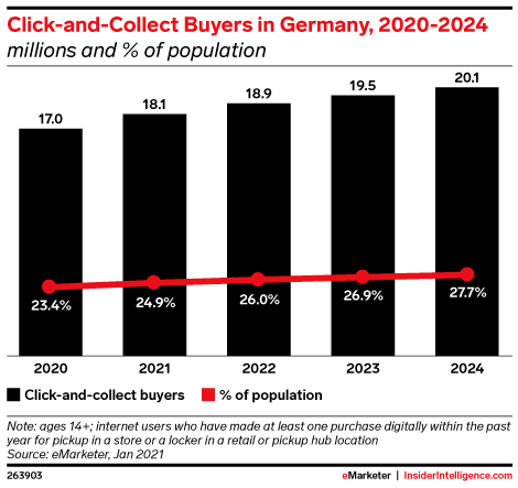 The number of click-and-collect buyers in Germany increased slightly during the pandemic, but not as much as in other Western European countries—and that lag will continue over the next few years. One bright spot, however, is that buyer penetration rates in Germany will steadily rise during that time.