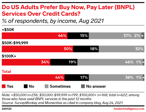 Many US adults favor buy now, pay later (BNPL) services over credit cards, with 44% of those who recently used the former preferring it when making purchases.