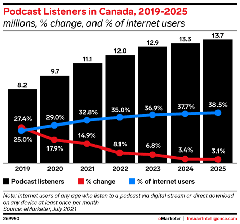 Canada’s digital audio audience is growing faster than any other digital medium we track in the country, including digital video viewers and social media users. This year, digital audio will match terrestrial radio in listenership and exceed it in engagement, according to our forecasts.