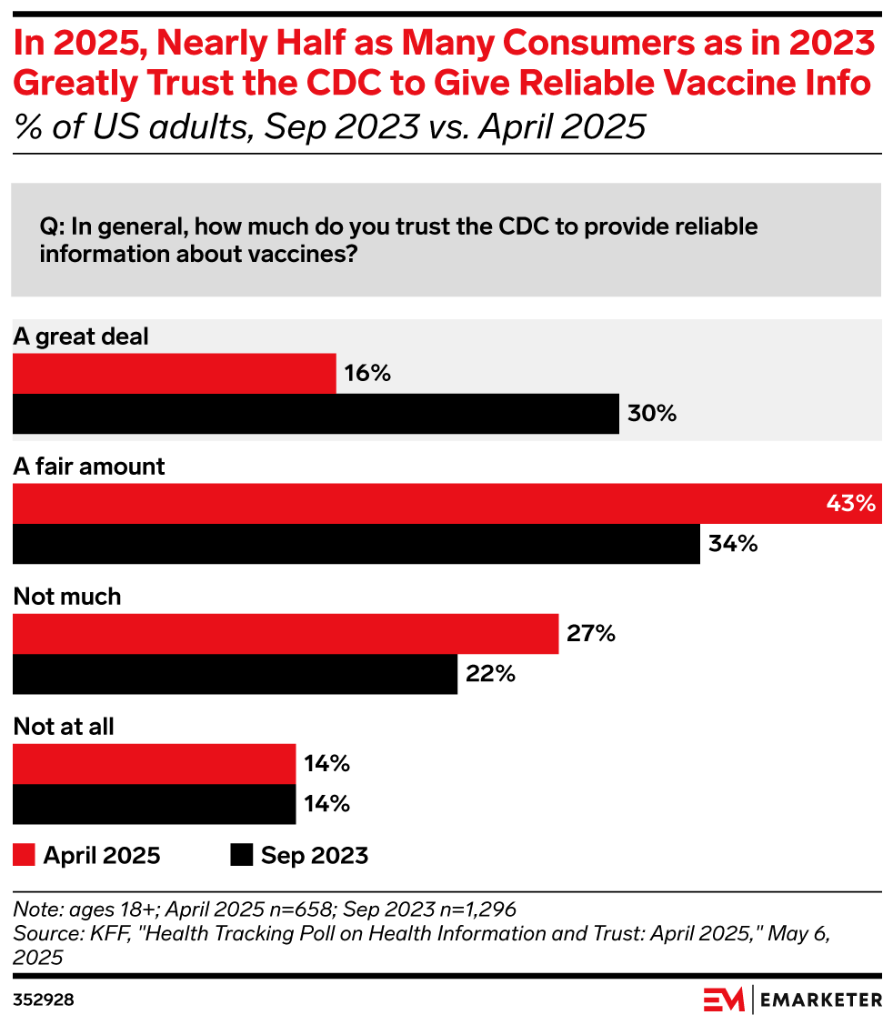 The news: President Trump fired the head of the CDC less than a month after she was approved by the Senate. At least four other senior leaders at the agency also resigned. Director Susan Monarez accused HHS and Secretary Robert F. Kennedy Jr. of “weaponizing public health for political gain and putting millions of American lives at risk” per a statement from her lawyers. Our take: Healthcare brands and pharma marketers need to take the lead and create science-based messaging about vaccines to counter misinformation. They can partner with influencer physicians on social media (where misinformation abounds) with engaging edutainment, and lean into local efforts with community partners like sponsored health screenings or free vaccine days.