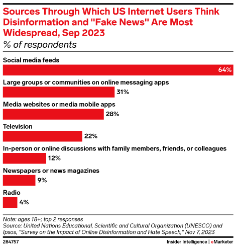 64% of US adults think disinformation and “fake news” are most widespread on social media, according to a September 2023 survey from UNESCO and Ipsos.
