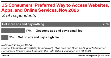 A majority (78%) of US consumers would rather pay nothing and encounter more ads across websites, apps, and online services than pay any amount and be served either some or no ads, per January 2024 data from the Interactive Advertising Bureau.