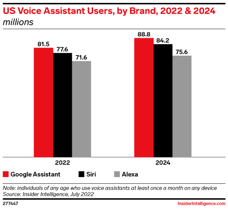 Google Assistant is the most popular voice assistant in the US, followed by Apple’s Siri and Amazon’s Alexa, per our estimates. Come 2024, 88.8 million people will use Google Assistant, 84.2 million will use Siri, and 75.6 million will use Alexa.