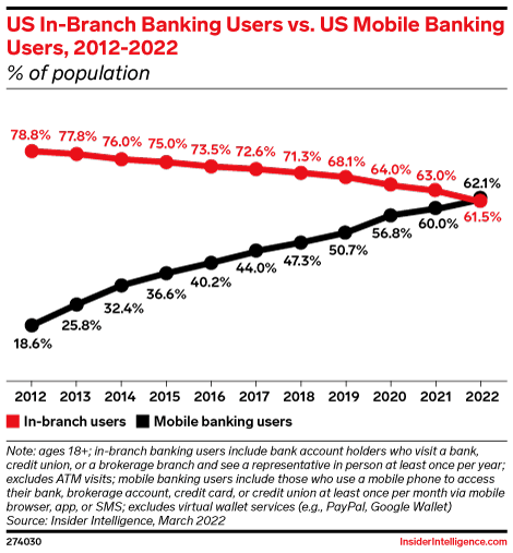 In a first, 62.1% of adults in the US will use mobile banking, surpassing the 61.5% who will use in-branch banking, per our forecast. This is a marked shift from 10 years ago, when 78.8% of adults used bank branches and 18.6% used mobile.