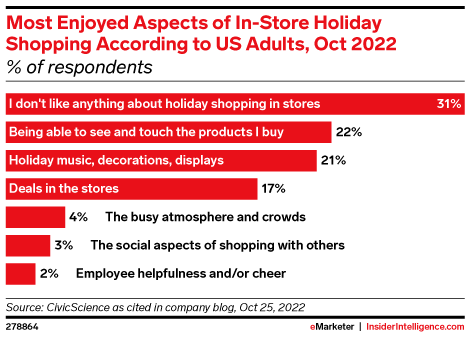 Close to a third of US adults don’t like anything about in-store holiday shopping, according to CivicScience. Meanwhile, for more than a fifth, experiencing the products is the biggest appeal. About the same share most enjoy the holiday music, decor, and displays, while 17% are after in-store deals.