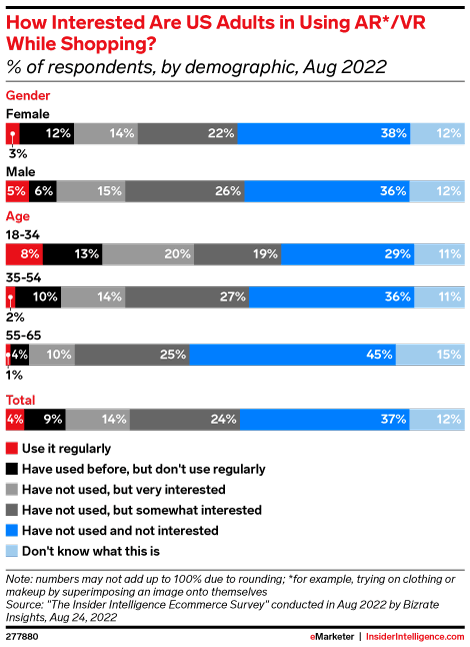 Only 13% of US adults have used augmented reality (AR) or virtual reality (VR) while shopping. Though the overwhelming majority have not, 38% are at least somewhat interested in trying the tech.