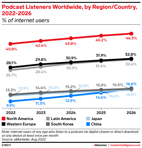 More than 40% of internet users in North America will be monthly podcast listeners by the end of this year, the highest rate of any region. Western Europe and Latin America follow with nearly 30% penetration among their online populations.