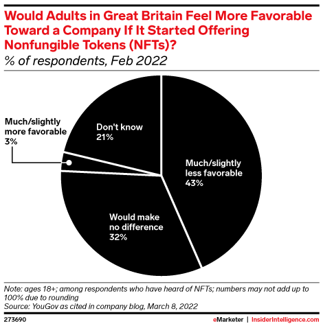 Companies tempted to ride the blockchain wave may want to avoid dipping their toes into nonfungible tokens (NFTs) just yet. Among adults in Great Britain who’d heard of NFTs, 43% said they’d feel less favorable toward a company if it started offering them, and 32% said their opinion wouldn’t change either way. Only 3% would view a company more favorably if it offered the digital tokens.