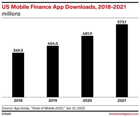 In 2021, mobile finance apps reached 573.1 million downloads in the US, up nearly 19% from 481.9 million in 2020.