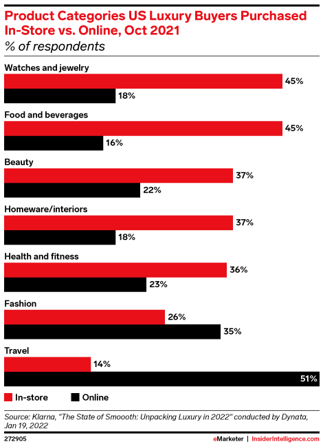 Across almost all product categories, US luxury shoppers are far more likely to make purchases in-store than online. Physical retail had the widest lead in the food and beverage category, followed by watches and jewelry. Digital got the upper hand in only fashion and travel, suggesting that for many tangible luxury goods, shoppers prefer to see and feel them before spending big bucks.