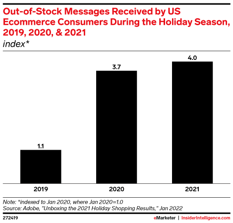 US shoppers saw more out-of-stock messages this past holiday season than in previous years, per an Adobe index that tracks this activity. The index rose to 4.0 during the 2021 season, when US ecommerce consumers received more than 6 billion out-of-stock messages. That’s about an 8% increase year over year and a 264% jump from the pre-pandemic 2019 season.