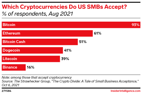 Of the small and medium-sized businesses (SMBs) in the US that accept cryptocurrency, 93% take payments in Bitcoin, making it the most commonly accepted crypto.