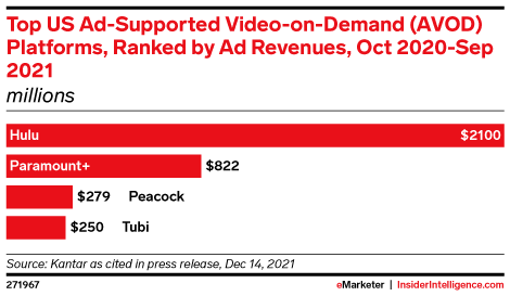 Hulu raked in $2.1 billion in ad revenues between October 2020 and November 2021, by far the most of any ad-supported video-on-demand (AVOD) platform in the US.