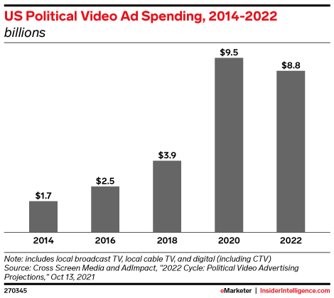 US political advertisers will splash out $8.8 billion on video in 2022, close to the record $9.5 billion spent in 2020, despite this year marking a midterm rather than presidential election.