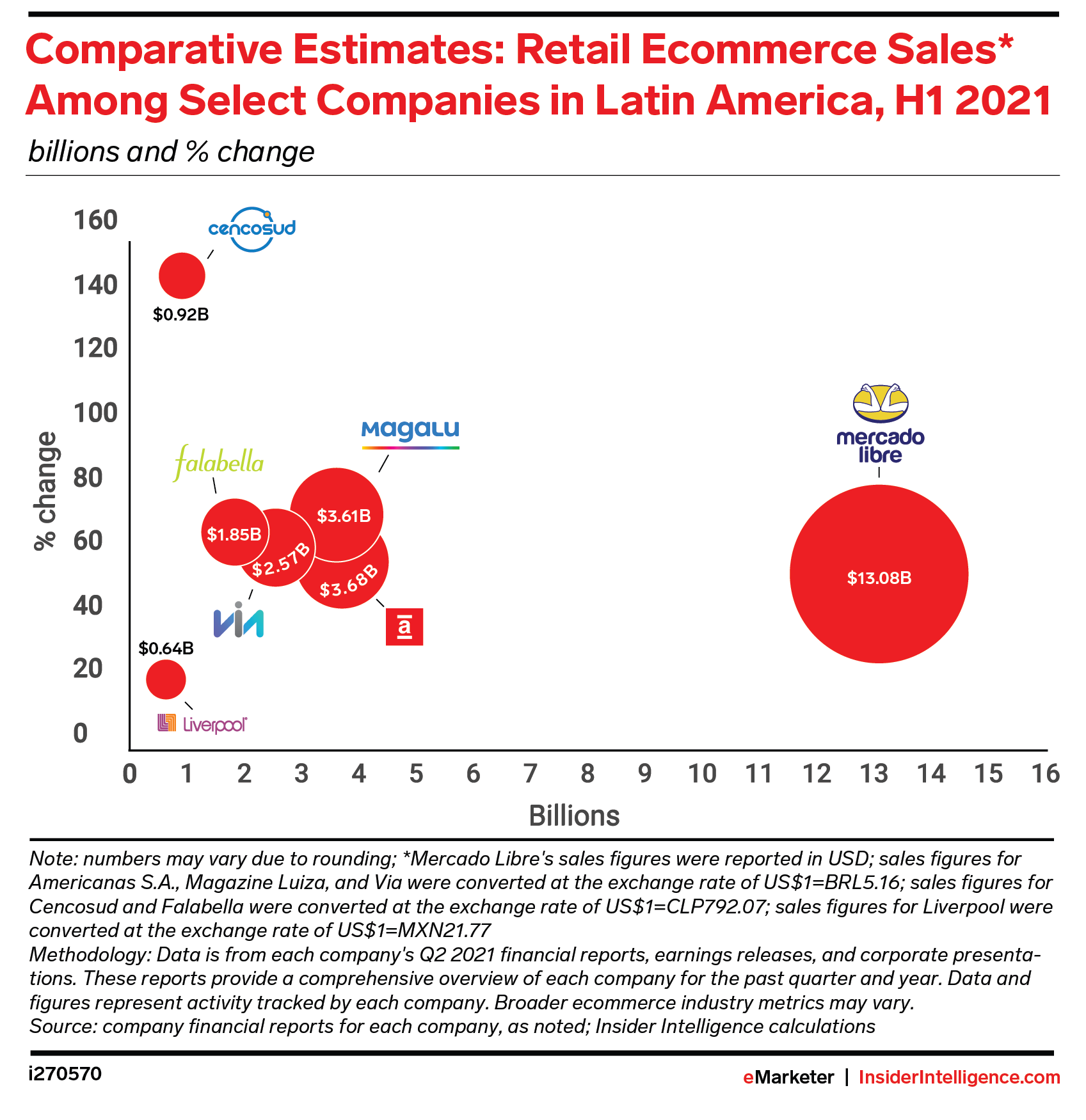 In H1 2021, Mercado Libre scooped up more than $13 billion in digital sales across Latin America, making it the region’s biggest ecommerce company.
