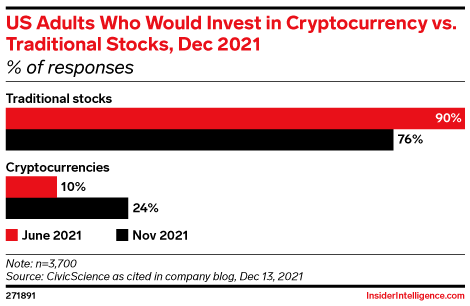 Cryptocurrencies are looking like a better bet for more and more investors. Last month, 24% of US adults said they would invest in cryptos, up from just 10% in June.