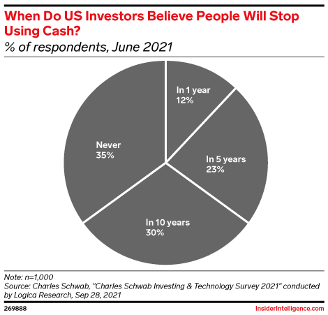 More than a third of US investors believe people will stop using cash sometime in the next five years, with 12% of those investors expecting this change to come within a year.