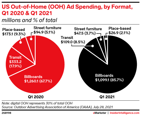 US spending decreased significantly across out-of-home (OOH) ad formats from Q1 2020 to Q1 2021, but not all categories were affected equally.