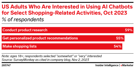 59% of US adults interested in using AI chatbots for shopping-related activities would use the tech for product research, according to SurveyMonkey.