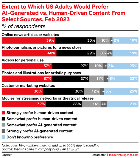 More than half of US adults prefer human-generated content across a broad range of media, according to an Ipsos survey. For news and photojournalism, for example, about 70% want to see human-made content. But for marketing websites and movies, US adults are slightly more open to AI-generated content.