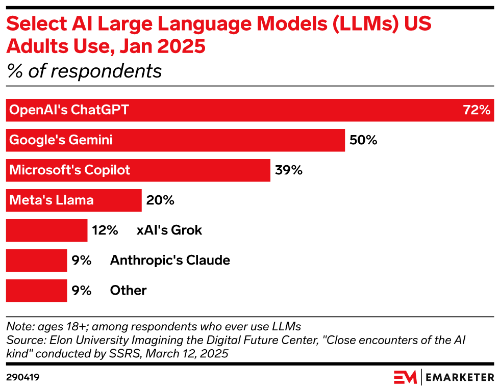 The news: ChatGPT isn’t just leading the chatbot race—it’s dominating it. With rapid growth and billions of daily prompts, it remains the go-to generative AI (genAI) tool for both businesses and consumers despite rising competition. The stats: Figures on the AI leader’s user growth are debated, but the most consistent recent number for weekly active users (WAUs) is 500 million—an increase from 100 million WAUs in November 2023, a year after its debut. That number tripled to 300 million by December 2024. Our take: As genAI evolves from a novelty product to a routine tool in workflows and daily life, ChatGPT is maintaining its role as an industry leader. To stay ahead, OpenAI should focus on improving ChatGPT as a core product and prove it can scale profits sustainably before racing to outbuild its rivals.