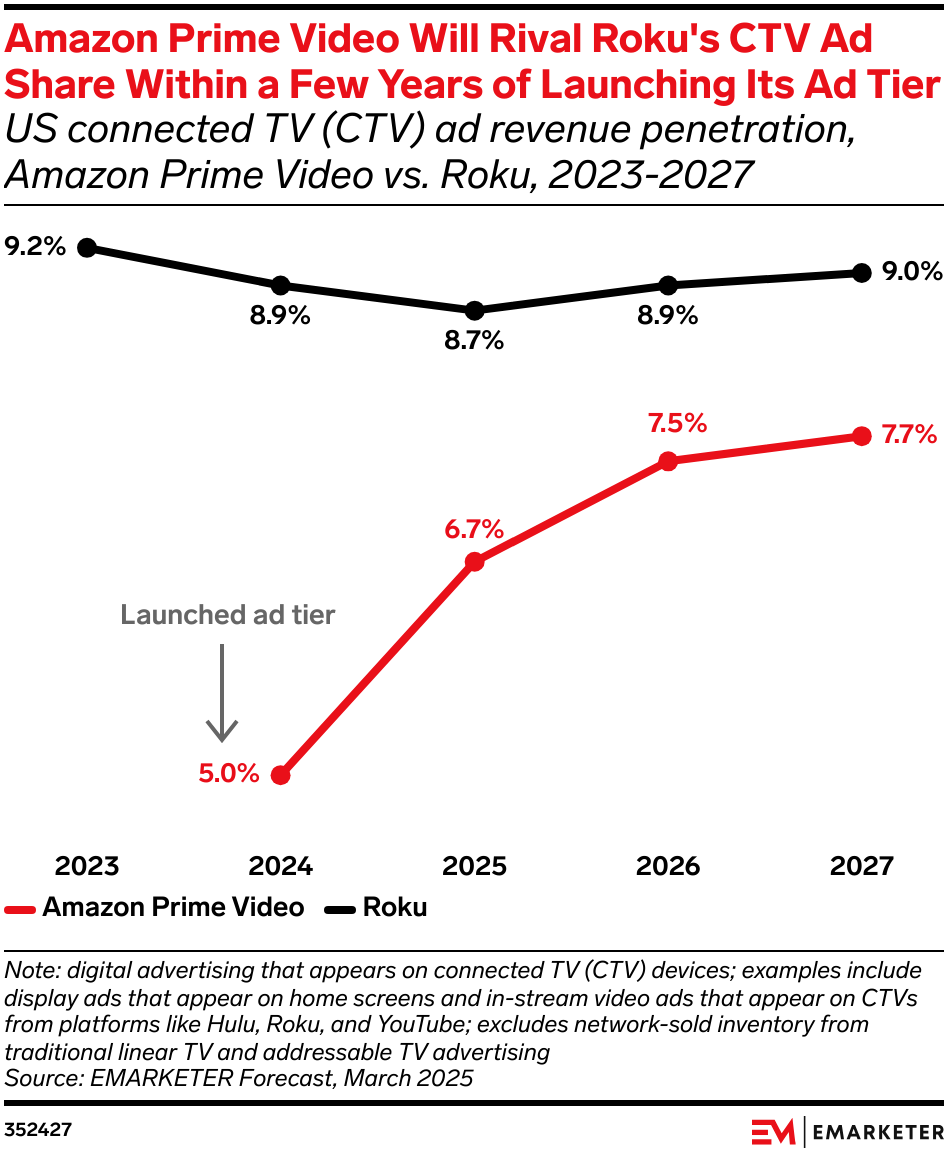 The news: YouTube’s lead in connected TV (CTV) advertising faces a real threat as Amazon Prime Video gains momentum. But that standing might be short-lived—Amazon’s Prime Video is on track to surpass YouTube as the top CTV advertising platform by 2027, per Morgan Stanley as cited by Business Insider. Our take: Marketers should expect CTV ad dollars to shift toward Amazon’s ecosystem by 2027. Early investment in Amazon’s premium, shoppable ads can secure top inventory and sharpen targeting as streaming evolves.