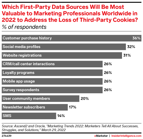 In preparation for the cookieless future, marketers are homing in on first-party data to target consumers. Worldwide, 36% of marketing professionals expect that customer purchase history will be their most valuable source of data once third-party cookies are gone. Meanwhile, 32% see social media profiles as key, and 31% plan to rely on website registrations.
