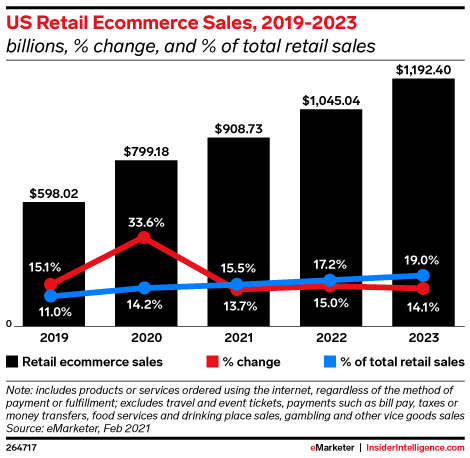 In 2020, the pandemic accelerated ecommerce sales growth significantly. Growth won’t be as high in 2021, but total sales will far exceed our pre-pandemic estimates.