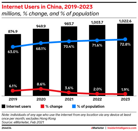 China will have 983.7 million internet users this year, thanks to an unexpected 8.6% boost in 2020, the fastest expansion its online population has seen since 2012. We previously forecast that it would take several more years for China’s internet users to hit the magical 1-billion mark, but we now project this unprecedented milestone will come by the end of next year.