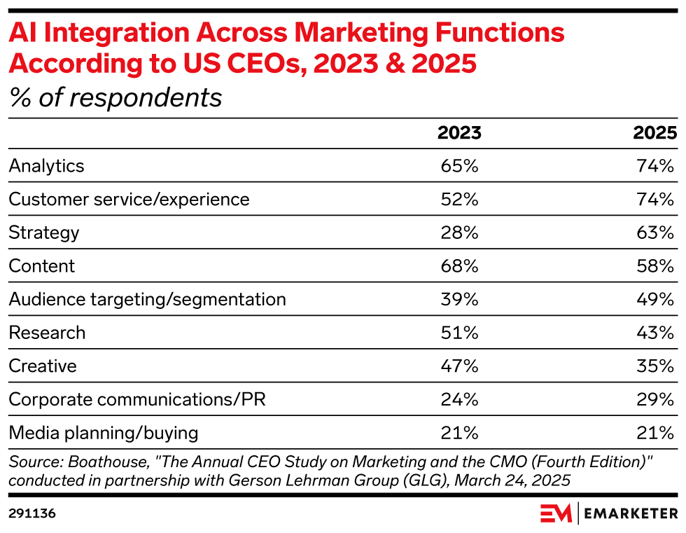 AI is rapidly becoming foundational to marketing strategy, with 63% of teams now using it for planning—up from 28% in 2023, per Boathouse. Customer service and analytics have seen similarly sharp increases, supported by rising investments in CRM systems, CDPs, and automation tools, according to Twilio. As AI’s footprint grows, marketers are reallocating spend toward digital formats like social, CTV, and video, where AI can optimize targeting and performance. This trend reflects a broader shift: the most successful marketers are embedding AI into the fabric of their decision-making, not treating it as a plug-in. The gap is widening fast.