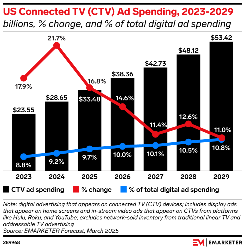 The news: National TV ad revenues will fall 11.4% this year, hitting $35.3 billion, while streamers are expected to rise 26% to $7.8 billion, per a Madison and Wall projection reported by MediaPost. Our take: Advertisers should continue shifting strategies to align with viewing habits and consumer behaviors—but remain cautious about complete CTV adoption, as opaque ad placements and looming economic pressures spell an uncertain future.