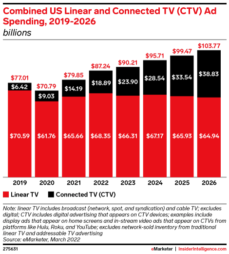 US linear TV ad spending will hit $68.35 billion this year and fall to $64.94 billion in 2026. Despite that decline, ad spending on linear and connected TV (CTV) combined will increase from $87.24 billion this year to more than $100 billion in 2026 due to the surge in CTV viewing.