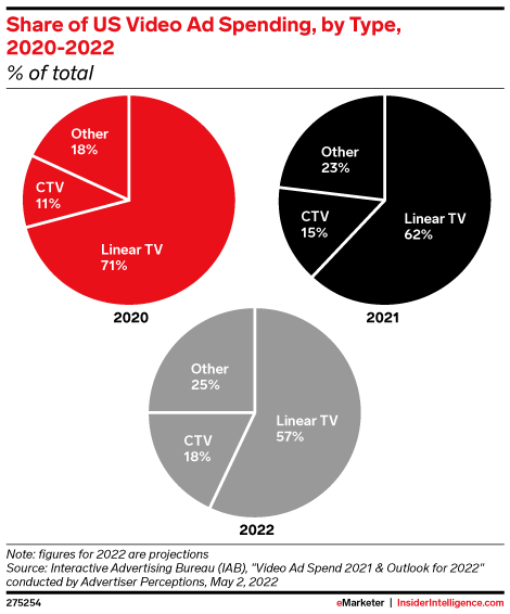 This year, 57% of US video ad spending will go to linear TV, a decline from 62% in 2021 and 71% in 2020. By comparison, ad spend share is increasing for connected TV (CTV) and other digital formats such as social video.