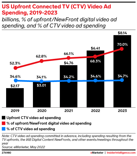 Upfront spending is flowing toward streaming services. Upfront CTV ad spending will grow by 34.6% to $6.41 billion this year. For context, that’s about how much we had predicted in our inaugural forecast would be spent on total CTV advertising in 2019.