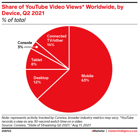 Around the world, mobile is the No. 1 device for watching YouTube, capturing 63% of the platform’s video views in Q2 2021.