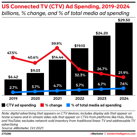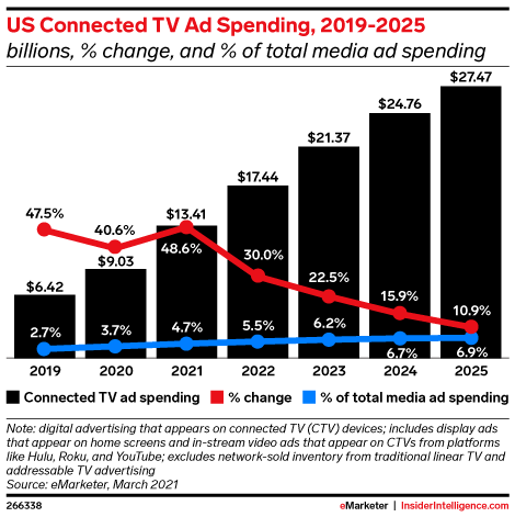 Connected TV (CTV) ad spend will reach $14.44 billion this year, up 59.9% from 2020.