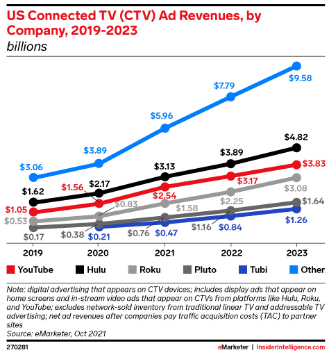 Among connected TV (CTV) companies we forecast, Hulu will lead in US ad revenues in 2021 at $3.13 billion, up 44% over 2020.