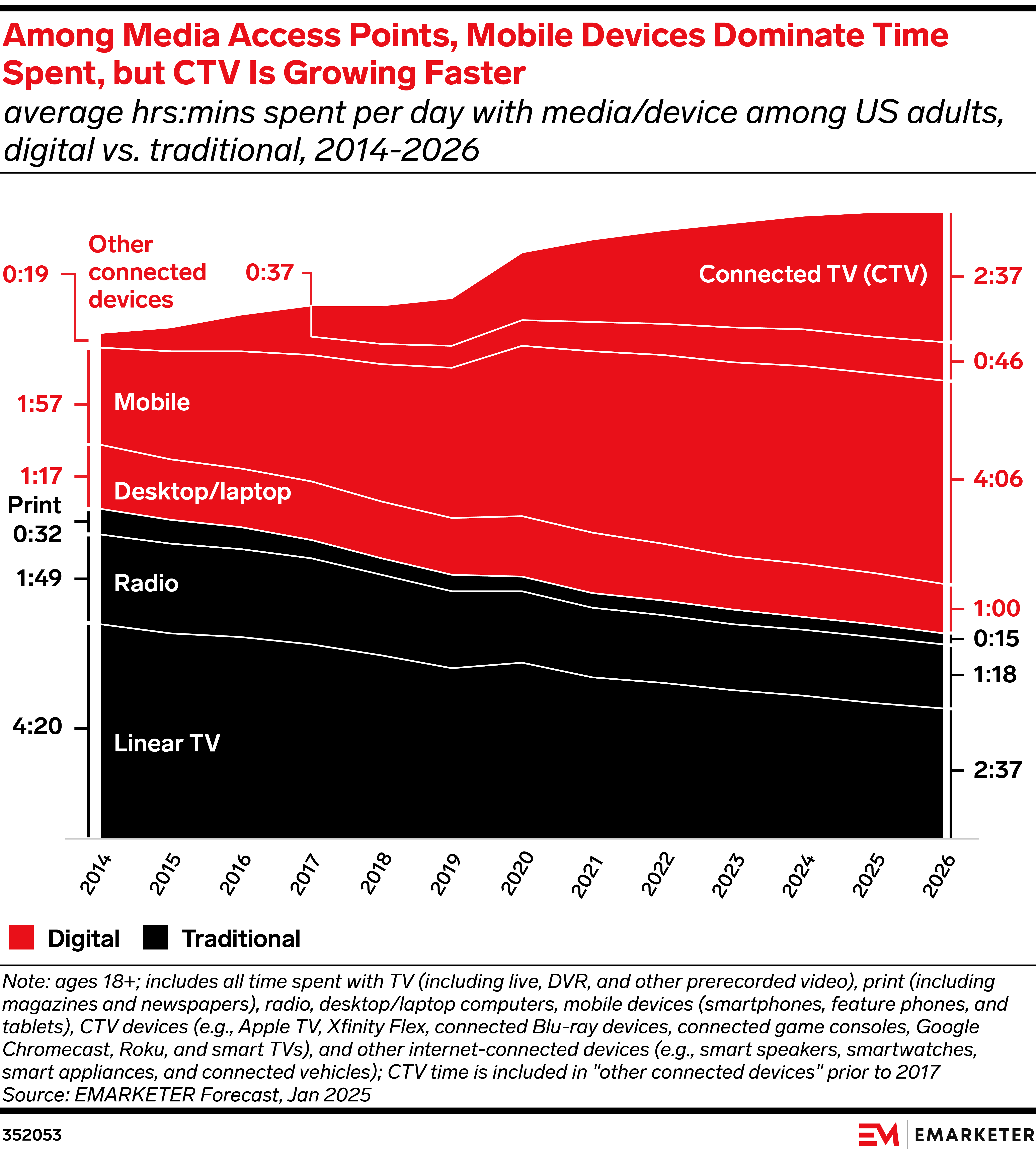 On today’s podcast episode, we discuss the battle between linear TV and CTV, one mobile device metric that is going down, and a surprising finding about which age group uses YouTube the most. Join Senior Director of Podcasts and host Marcus Johnson, Principal Forecasting Writer Ethan Cramer-Flood, and Senior Director of Forecasting Oscar Orozco. Listen everywhere and watch on YouTube and Spotify.