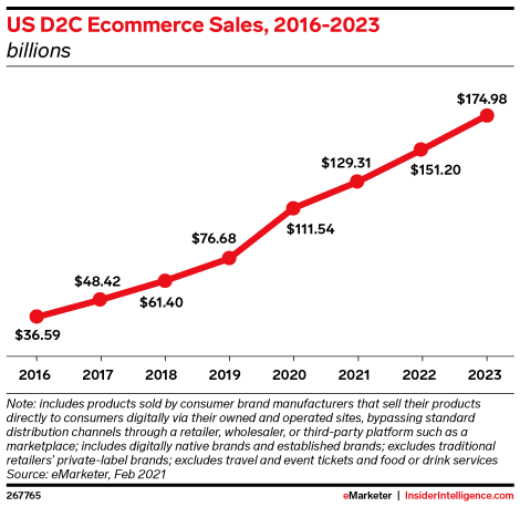 There’s a lot of attention paid to direct-to-consumer (D2C) brands right now, and for good reason: in addition to the pandemic-fueled 45.5% growth from 2019 to 2020, US digital D2C sales are expected to grow another 15.9% in 2021, reaching $175 billion by 2023, according to our estimates.