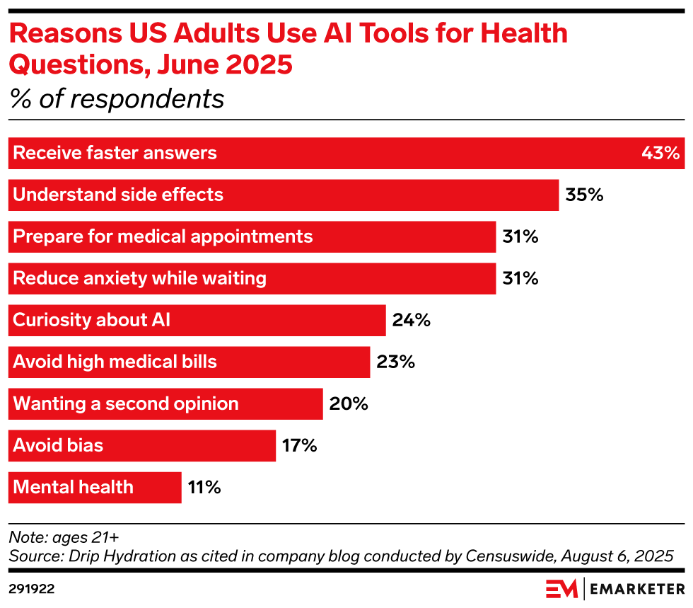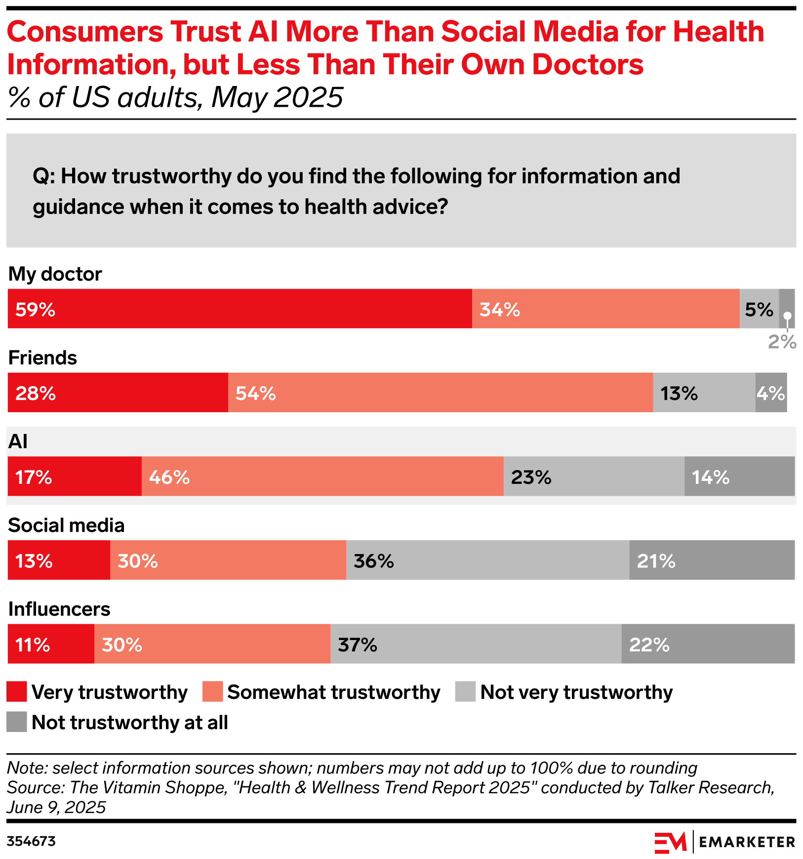 Approximately 35% of US adults report using AI tools to learn about and manage aspects of their health and wellness, according to a recent study conducted by The Vitamin Shoppe and Talker Research. As more people grow to trust AI for health information, they may move away from social media and influencer-driven health content that they have never found very reliable. Consumers will increasingly value AI that links to verifiable sources over social videos that often lack accountability. Healthcare and pharma marketers shouldn’t make any drastic pivot away from social media, but should closely track shifts in how consumers engage with social and influencer health content.
