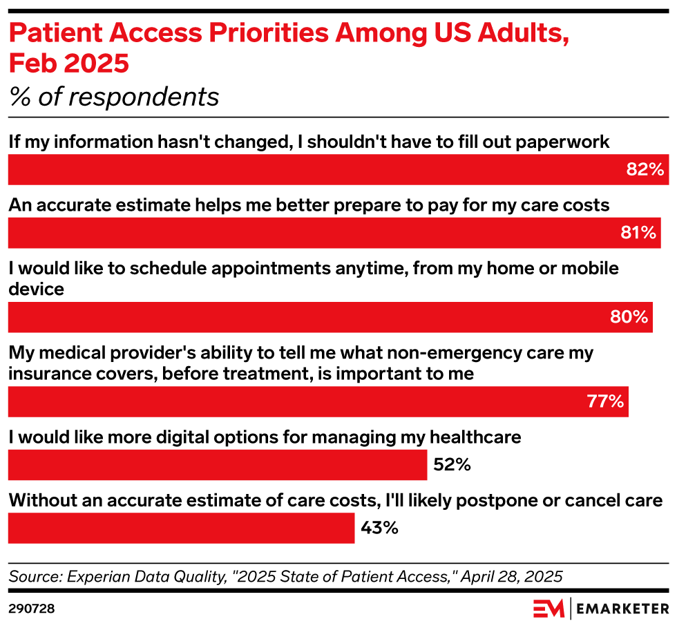 The data: Healthcare providers are struggling to get patients to use digital tools for scheduling appointments and paying for care, according to a recent Experian Health report. Our take: Clinic staff should gauge patients’ comfort level with using specific online tools at the first visit. These queries could give marketers the necessary information to remind people of the tech that’s available to them for accessing and managing their care. Further education around understanding medical bills and the importance of filling out pre-visit forms could drive patients to use a provider’s portal for these purposes.