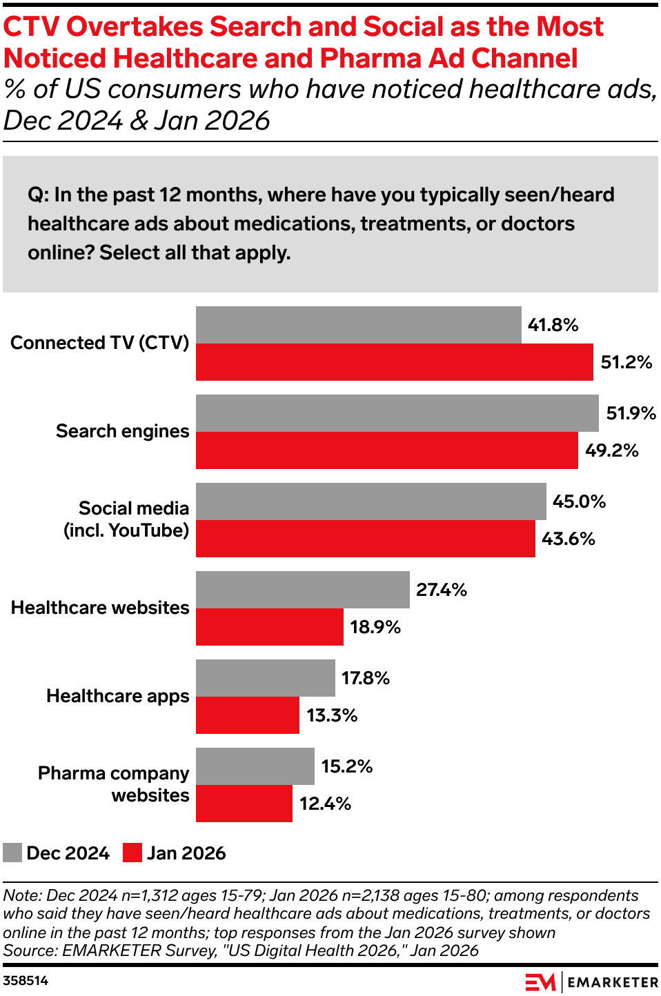 51% US consumers now notice healthcare and pharma advertising on CTV, putting it ahead of search and social.