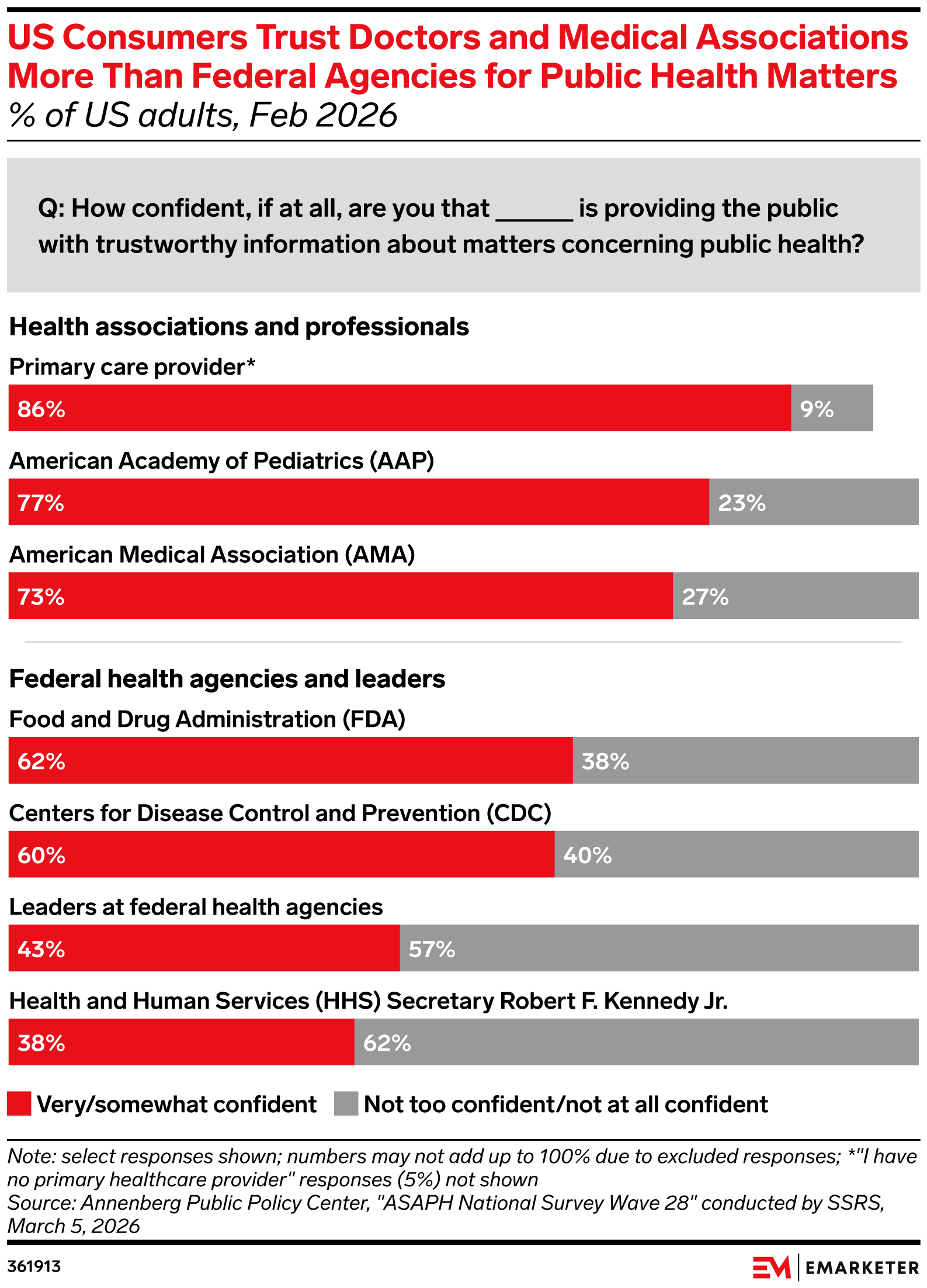 Americans’ trust in federal health agencies and political leaders continues to erode, but while many are confused about what to believe, they still want clearer guidance, per the latest Axios/Ipsos American Health Index. Federal agency staffing cuts, shifting vaccine guidance, and the glut of social media health information have fragmented Americans’ health trust. But trust hasn’t completely disappeared; it’s just gone local. Consumers still believe their doctors and families, creating an opening for healthcare and pharma brands to deliver clear, credible information through those trusted messengers.