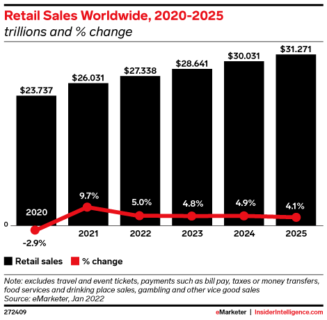 In May 2021, we predicted total retail sales around the world for that year would increase by 6.0% to just over $25 trillion, a significant comeback from 2020’s lows.